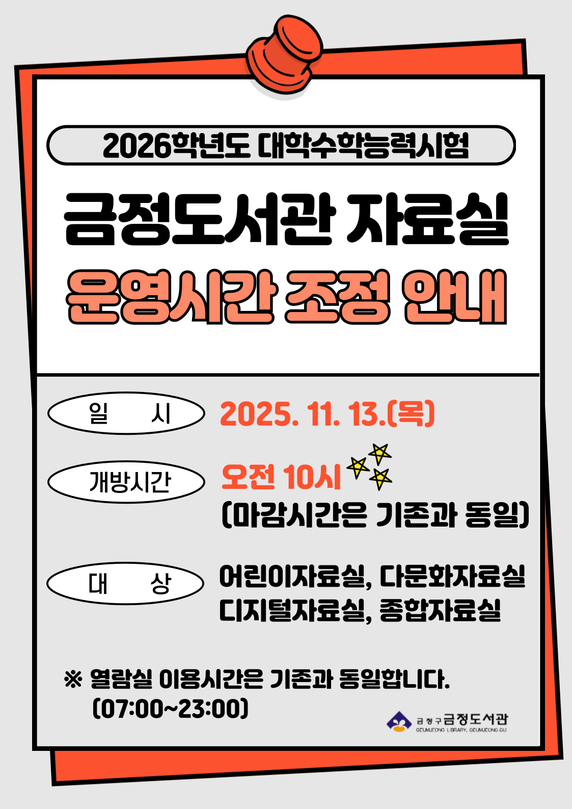 ※ 2025. 11. 13.(목)은 대학수학능력시험 시행일로 아래와 같이 운영 시간을 조정합니다. - 일 시 : 2025. 11. 13.(목) - 개방시간 : 오전 10시 (마감시간은 기존과 동일) - 대 상 : 종합실, 디지털실,어린이실,다문화실 ※ 열람실 이용시간은 기존과 동일합니다. (07:00~23:00)